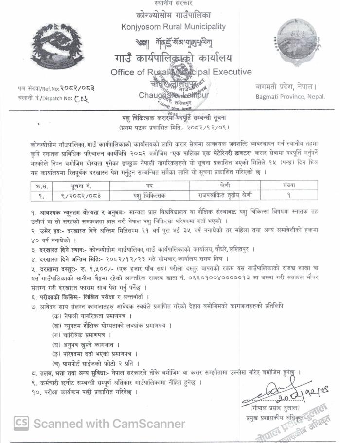 पशु चिकित्सक करारमा पदपूर्ति सम्बन्धी सूचना